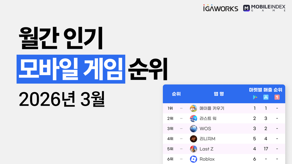 안녕하세요, 모바일인덱스 GAME입니다. 26년 1월에는 과연 어떤 모바일 게임들이 인기였을까요? 모바일인덱스 GAME 데이터를 통해 확인해 보겠습니다. 본문의 하이퍼링크를 클릭하시면 해당 앱의 상세한 데이터를 확인하실 수 있습니다! *해당 리포트는 26년 1월 데이터를 기준으로 작성되었습니다. 인기 모바일 게임 TOP10 2026년 1월 모바일 게임 시장은 신규 진입작의 급격한 변동보다는 기존 메가 히트작들의 강력한 사용자 팬덤과 대규모 업데이트가 성과를 주도했습니다. 특히 1년 이상 정상을 지킨 'Roblox'의 독주와 신규 캐릭터 출시로 매출 정점을 찍은 '메이플 키우기'의 활약이 돋보였습니다. 1위: Roblox (267만 명) 2위: 블록 블라스트 (230만 명) 3위: 전략적 팀 전투 (141만 명) 4위: 브롤스타즈 (130만 명) 5위: 로얄매치 (130만 명) [모바일 인기 게임 순위 TOP50] 월간 게임 매출 T